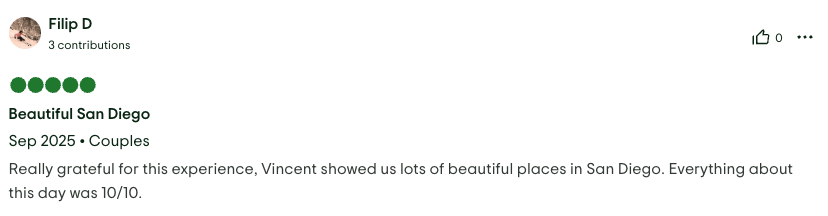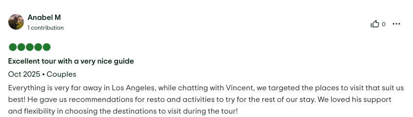 REVIEWS Have a look at what previous clients said about their experience with Vincent when booking private tours in Los Angeles. Reviews sourced from TripAdvisor Reviews sourced from ToursByLocals